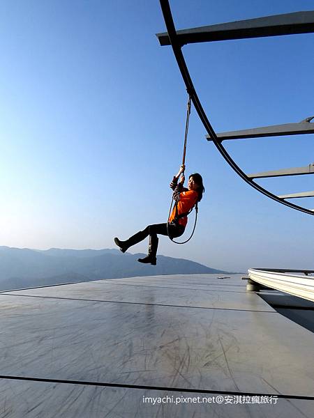 這應該是最瘋狂的一步了! 靠著繩索以及走道上的軌道,支撐身體的重量。靠著一小段助跑,然後飛在空中。真心覺得 好好玩! 闖過了這一關,就真的玩開了! 開始來個空中飛踢,故意沿著最邊緣的地方走。原來,我也可以膽量沒有極限。