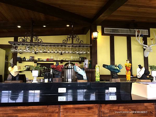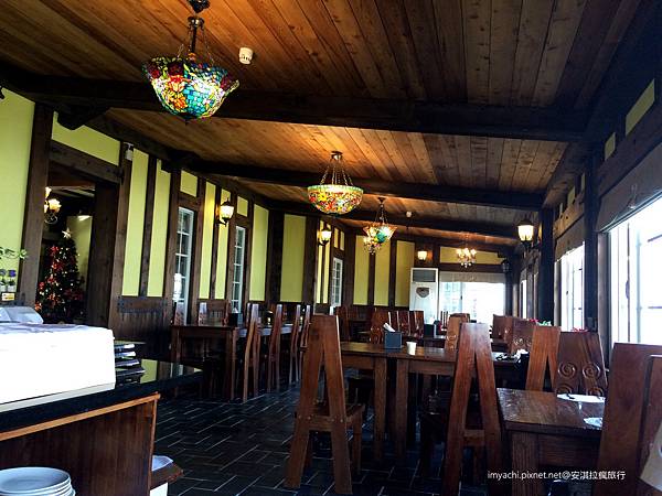 室內是大理石地板,搭配木頭桌椅,彩色玻璃燈,溫馨的古堡風格。