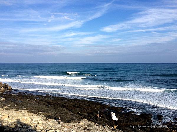 泳池在過去,可以直接走到岸邊。很幸運地看到一對正在拍婚紗的情侶,想必在這碧海藍天下,婚紗一定很美。