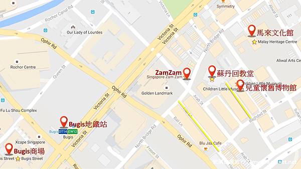 武吉士(Bugis)地鐵站 -> ZamZam餅店 -> 蘇丹回教堂 -> 馬來文化館 -> 巴梭拉街 -> 兒童懷舊博物館 -> 哈芝巷 -> 武吉士商場